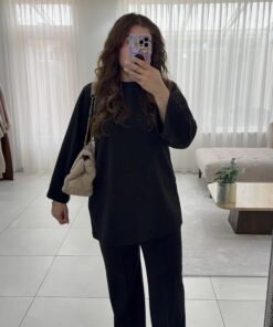 Deze zwarte oversized set combineert comfort en elegantie in één. De losse pasvorm, zachte stof en minimalistische look maken dit de perfecte outfit voor elke dag – van casual tot chic.